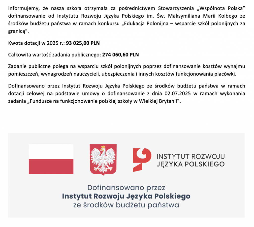 Subskrypcja roczna w roku szkolnym 2025-2026 wynosi £350 (50% zniżki za drugie dziecko) dla osób płacących całość w terminie do końca września 2025.
