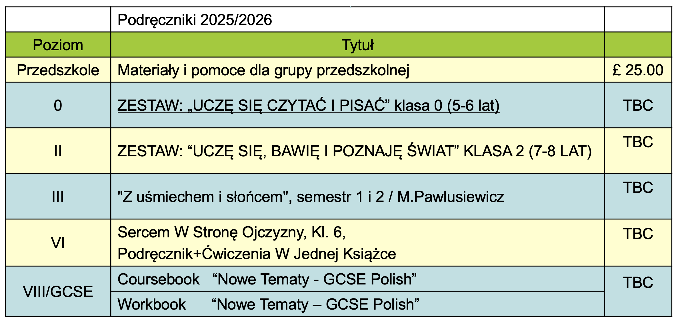 Aby zamówić podręcznik u nas należy dokonać wpłaty na konto szkolne sumy według tabeli najpóźniej do soboty 20 września 2025. Jako ” Reference Number” proszę wpisać inicjały,datę urodzenia dziecka oraz klasę np. XY21.12.2011/KL3