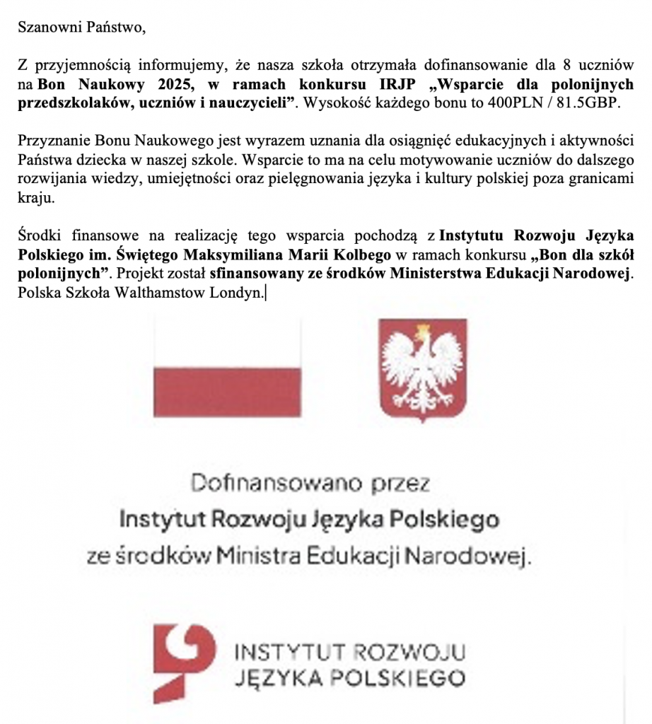 The Polish School Walthamstow website contains links to other sites and is provided as a convenience to you. You are under no obligation to use these sites, but if you choose to do so, please be aware that these sites have separate content, privacy and data collection policies. Please refer to these before interacting with the site. The Polish School Walthamstow cannot accept responsibility for any use of your personal information by these sites.